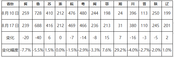 截至8月17日,重點(diǎn)監(jiān)測(cè)省份生產(chǎn)企業(yè)庫(kù)存總量為3906萬(wàn)重量箱,較上周四庫(kù)存下降83萬(wàn)重量箱,降幅2.08%,庫(kù)存環(huán)比降幅縮小7.71個(gè)百分點(diǎn),庫(kù)存天數(shù)約19.11天,較上周減少0.40天(注:本期庫(kù)存天數(shù)以截至本周四樣本企業(yè)在產(chǎn)日熔量核算)。本周重點(diǎn)監(jiān)測(cè)省份產(chǎn)量1311.00萬(wàn)重量箱,消費(fèi)量1394.00萬(wàn)重量箱,產(chǎn)銷(xiāo)率106.33%。